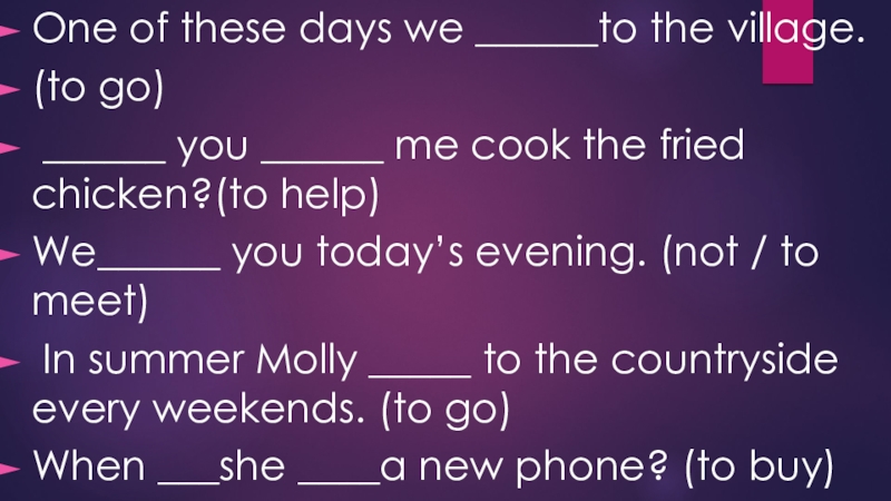 One of these days we ______to the village. (to go) ______ you ______ me cook the fried