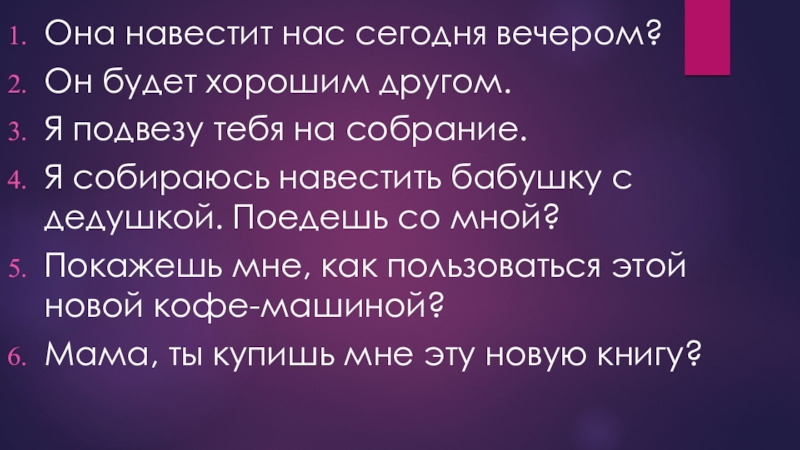 Она навестит нас сегодня вечером? Он будет хорошим другом. Я подвезу тебя на собрание. Я собираюсь навестить