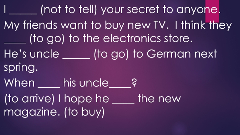 I _____ (not to tell) your secret to anyone.My friends want to buy new TV. I think