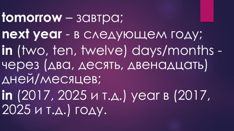 tomorrow – завтра;next year - в следующем году;in (two, ten, twelve) days/months - через (два, десять, двенадцать)
