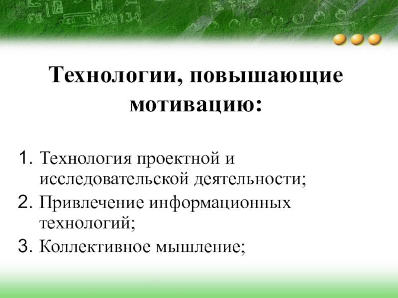 Технологии, повышающие мотивацию:Технология проектной и исследовательской деятельности;Привлечение информационных технологий;Коллективное мышление;