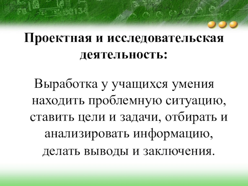 Проектная и исследовательская деятельность:Выработка у учащихся умения находить проблемную ситуацию, ставить цели и задачи, отбирать и анализировать