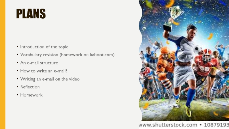 plansIntroduction of the topic Vocabulary revision (homework on kahoot.com)An e-mail structure How to write an e-mail? Writing