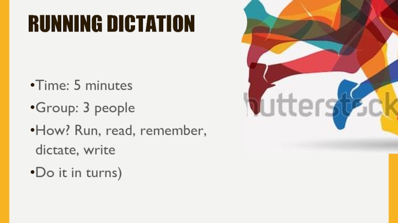 Running dictationTime: 5 minutesGroup: 3 peopleHow? Run, read, remember, dictate, write Do it in turns)