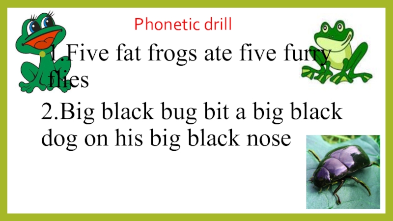 Phonetic drill1.Five fat frogs ate five furry flies2.Big black bug bit a big black dog on his