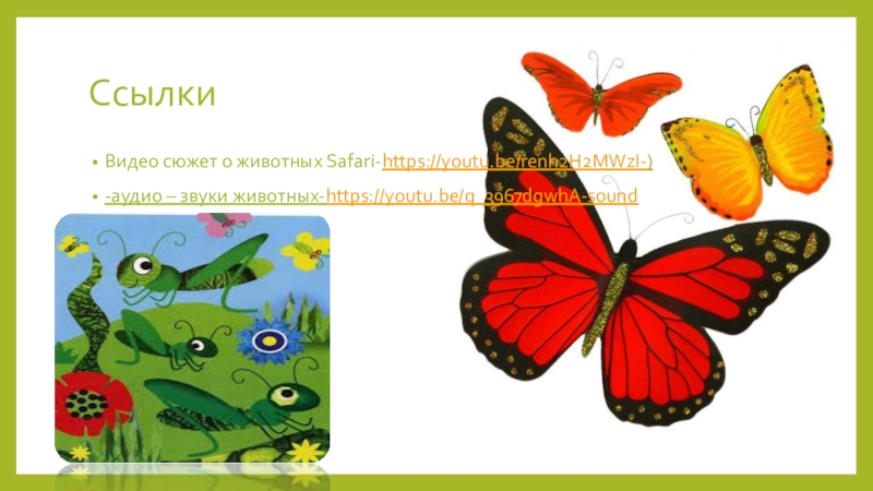 Ссылки Видео сюжет о животных Safari-https://youtu.be/renh2H2MWzI-)-аудио – звуки животных-https://youtu.be/q_3967dgwhA-sound