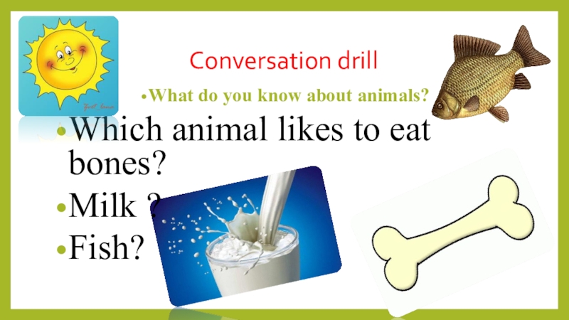 Conversation drillWhat do you know about animals?Which animal likes to eat bones?Milk ?Fish?