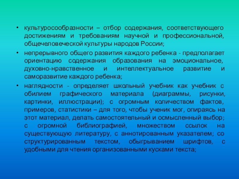 наглядности - определяет школьный учебник как учебник с обилием графического материала (диаграммы, рисунки, картинки, иллюстрации); с огромным количеством фактов, примеров, статистики – для того, чтобы ученик мог, опираясь на этот материал, делать самостоятельный и осмысленный выбор; с огромной библиографией, множеством ссылок на существующую литературу, с аннотированным указателем; со структурированным текстом, обыгрыванием шрифтов, с удобными для чтения организованными кусками текста;