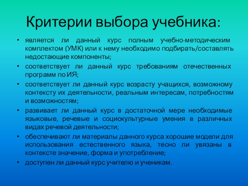 Выбирая тот или иной учебник или целостный учебно-методический комплект (УМК), учителю следует исходить из особенностей образовательного учреждения, т.е. из типа школы, возрастных и индивидуальных особенностей своих учащихся, своего менталитета.