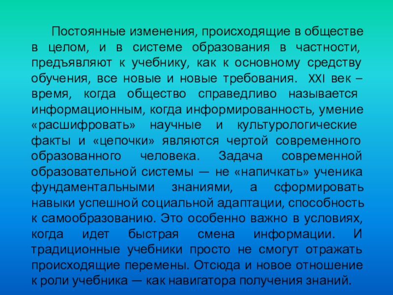 и в системе образования в частности, предъявляют к учебнику, как к основному средству обучения, все новые и новые требования. XXI век – время, когда общество справедливо называется информационным, когда информированность, умение «расшифровать» научные и культурологические факты и «цепочки» являются чертой современного образованного человека. Задача современной образовательной системы — не «напичкать» ученика фундаментальными знаниями, а сформировать навыки успешной социальной адаптации, способность к самообразованию. Это особенно важно в условиях, когда идет быстрая смена информации. И традиционные учебники просто не смогут отражать происходящие перемены. Отсюда и новое отношение к роли учебника — как навигатора получения знаний.