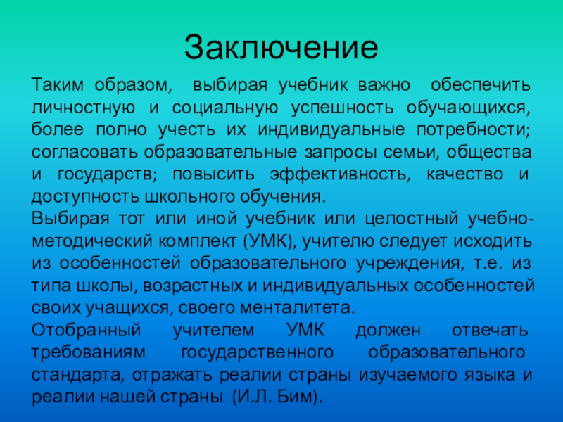Отобранный учителем УМК должен отвечать требованиям государственного образовательного стандарта, отражать реалии страны изучаемого языка и реалии нашей страны (И.Л. Бим).