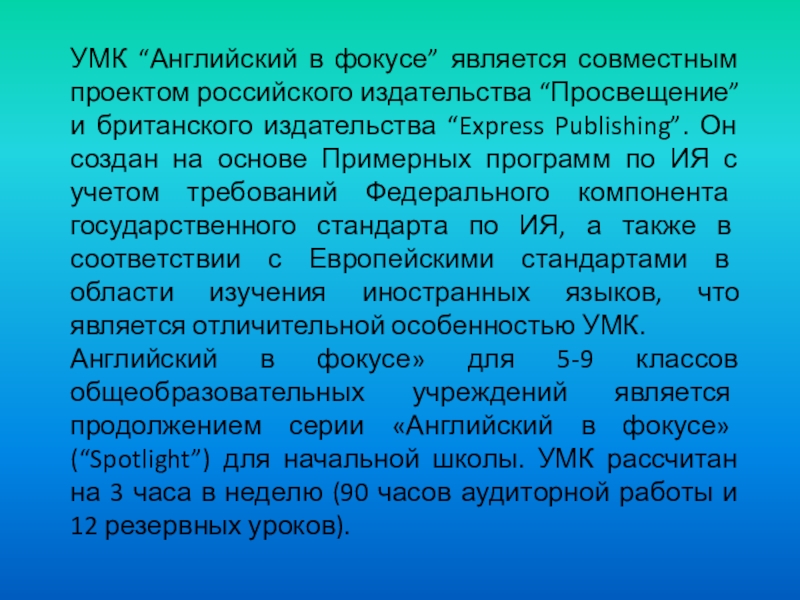 Английский в фокусе» для 5-9 классов общеобразовательных учреждений является продолжением серии «Английский в фокусе» (“Spotlight”) для начальной школы. УМК рассчитан на 3 часа в неделю (90 часов аудиторной работы и 12 резервных уроков).