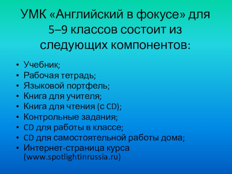Слайд 12УМК «Английский в фокусе» для 5–9 классов состоит из следующих компонентов: