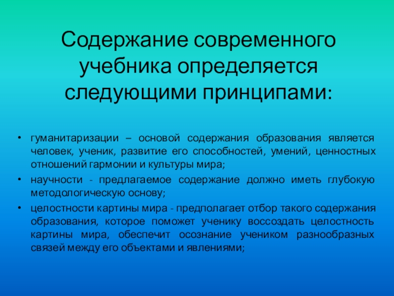 Слайд 4Содержание современного учебника определяется следующими принципами:
