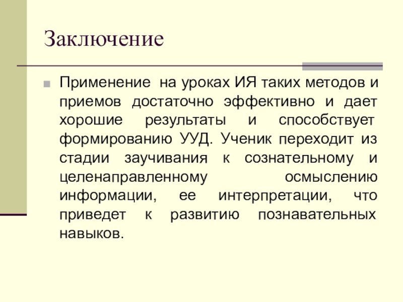дает хорошие результаты и способствует формированию УУД. Ученик переходит из стадии заучивания к сознательному и целенаправленному осмыслению информации, ее интерпретации, что приведет к развитию познавательных навыков.