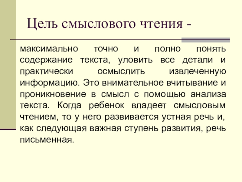все детали и практически осмыслить извлеченную информацию. Это внимательное вчитывание и проникновение в смысл с помощью анализа текста. Когда ребенок владеет смысловым чтением, то у него развивается устная речь и, как следующая важная ступень развития, речь письменная.