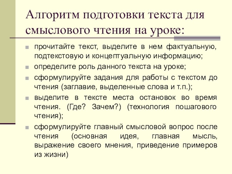 Слайд 5Алгоритм подготовки текста для смыслового чтения на уроке: