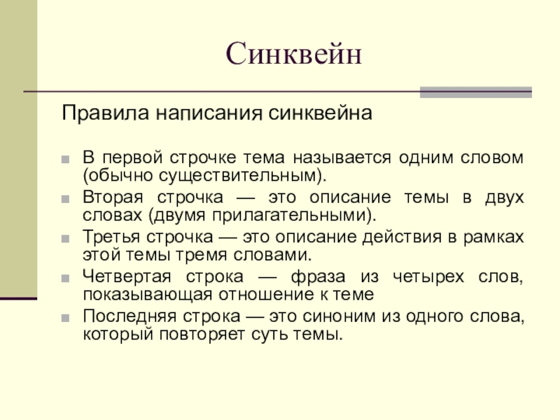 Четвертая строка — фраза из четырех слов, показывающая отношение к теме