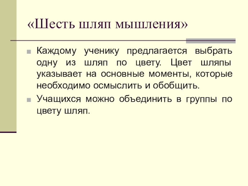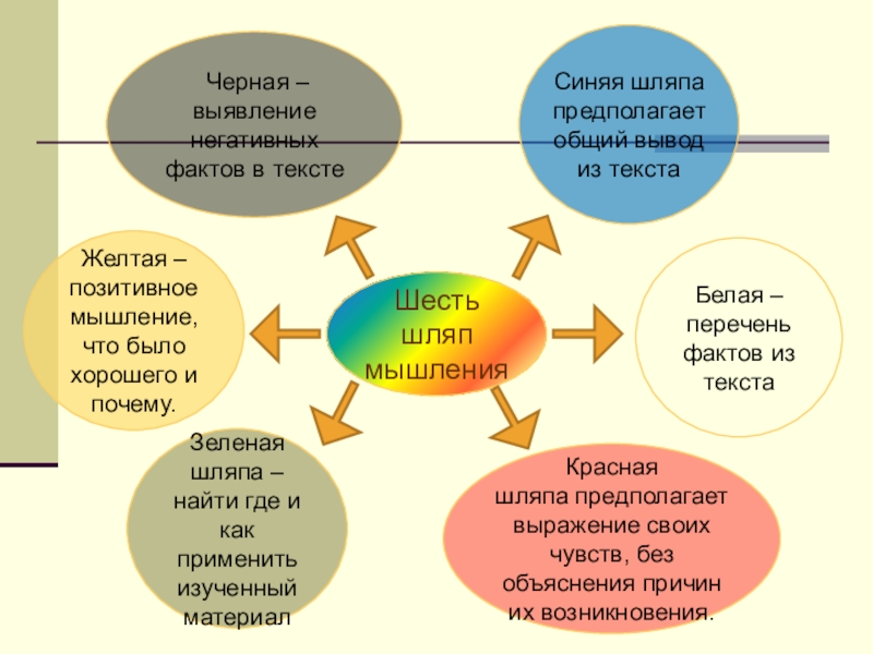 Цвет шляпы указывает на основные моменты, которые необходимо осмыслить и обобщить.