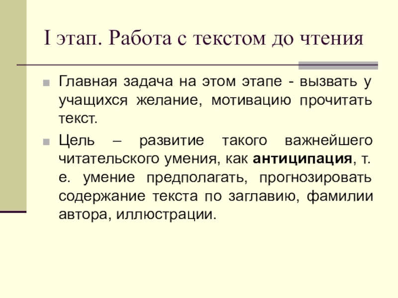 Цель – развитие такого важнейшего читательского умения, как антиципация, т.е. умение предполагать, прогнозировать содержание текста по заглавию, фамилии автора, иллюстрации.