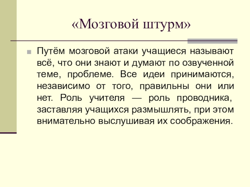 думают по озвученной теме, проблеме. Все идеи принимаются, независимо от того, правильны они или нет. Роль учителя — роль проводника, заставляя учащихся размышлять, при этом внимательно выслушивая их соображения.