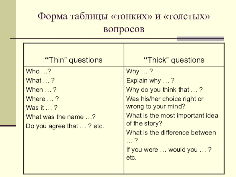 Слайд 16Форма таблицы «тонких» и «толстых» вопросов