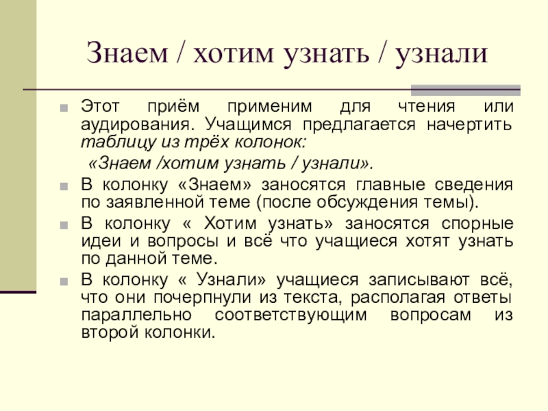 В колонку « Хотим узнать» заносятся спорные идеи и вопросы и всё что учащиеся хотят узнать по данной теме.