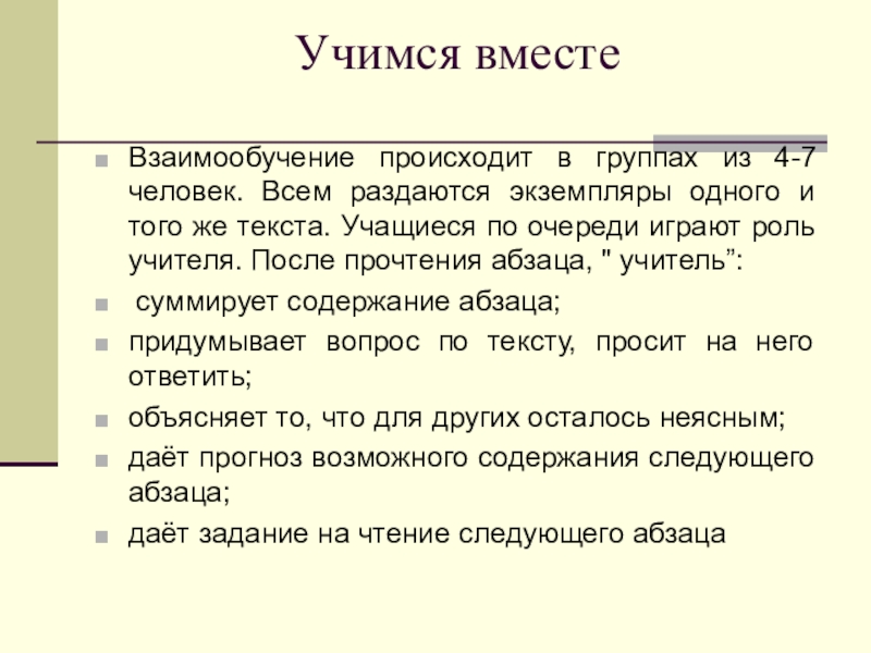 Взаимообучение происходит в группах из 4-7 человек. Всем раздаются экземпляры