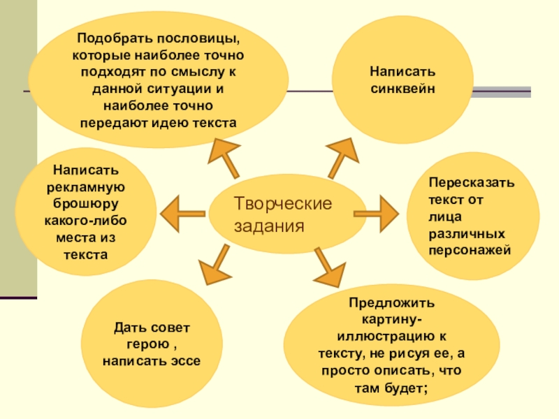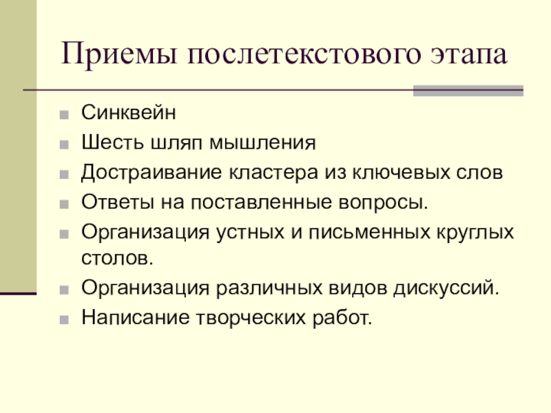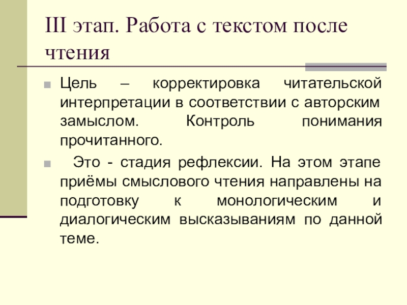 Это - стадия рефлексии. На этом этапе приёмы смыслового чтения направлены на подготовку к монологическим и диалогическим высказываниям по данной теме.