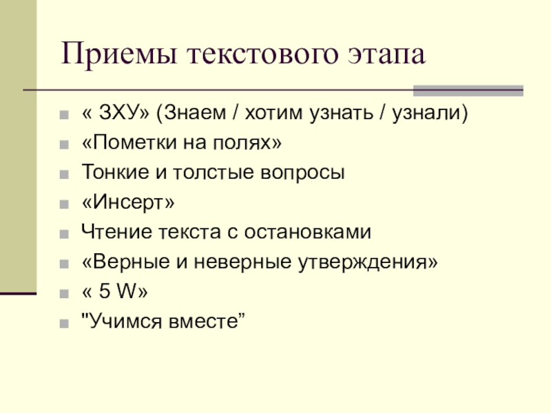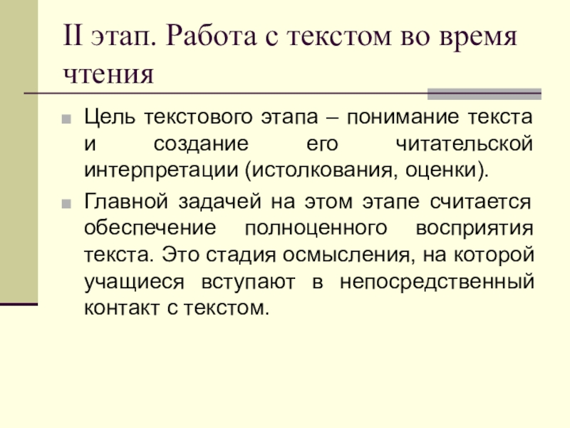 Главной задачей на этом этапе считается обеспечение полноценного восприятия текста. Это стадия осмысления, на которой учащиеся вступают в непосредственный контакт с текстом.
