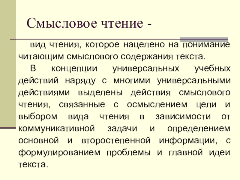 В концепции универсальных учебных действий наряду с многими универсальными действиями выделены действия смыслового чтения, связанные с осмыслением цели и выбором вида чтения в зависимости от коммуникативной задачи и определением основной и второстепенной информации, с формулированием проблемы и главной идеи текста.