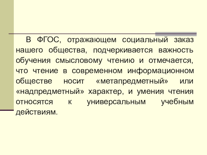 чтению и отмечается, что чтение в современном информационном обществе носит «метапредметный» или «надпредметный» характер, и умения чтения относятся к универсальным учебным действиям.