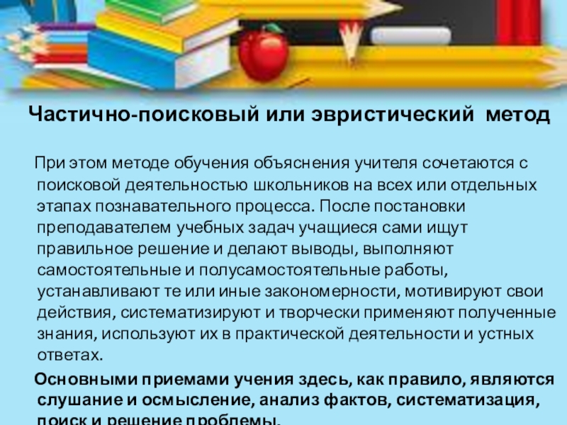 с поисковой деятельностью школьников на всех или отдельных этапах познавательного процесса. После постановки преподавателем учебных задач учащиеся сами ищут правильное решение и делают выводы, выполняют самостоятельные и полусамостоятельные работы, устанавливают те или иные закономерности, мотивируют свои действия, систематизируют и творчески применяют полученные знания, используют их в практической деятельности и устных ответах.