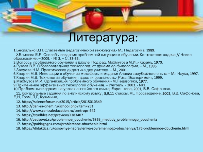 1.Беспалько В.П. Слагаемые педагогической технологии.- М.: Педагогика, 1989.
