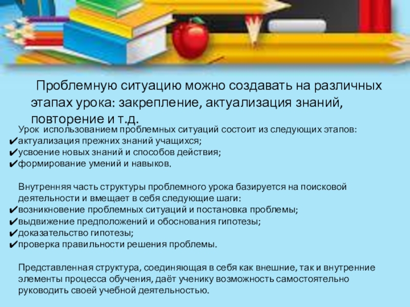 Слайд 25 Проблемную ситуацию можно создавать на различных этапах урока: закрепление, актуализация знаний,
