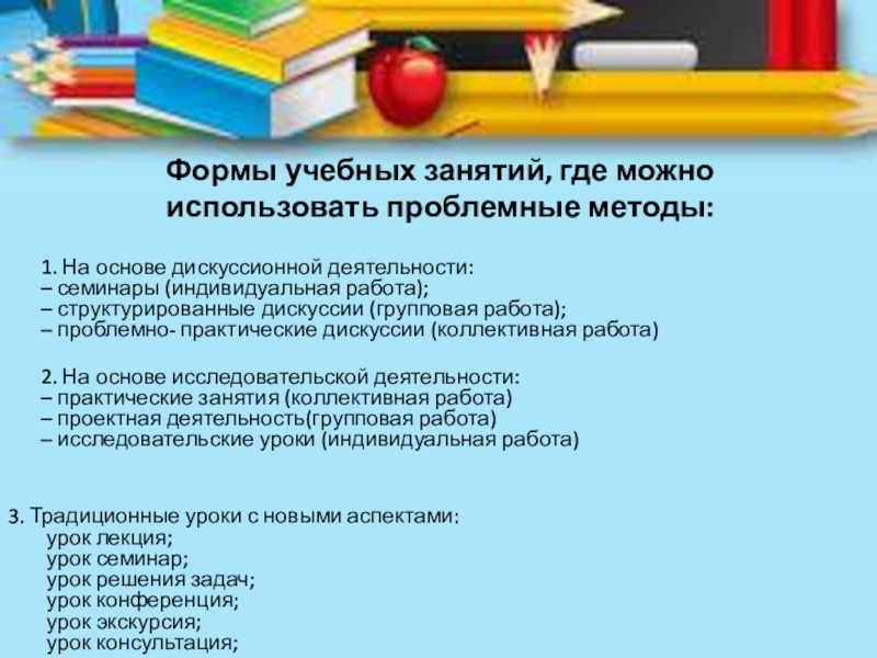 6. Формы учебных занятий, где можно использовать проблемные методы.
