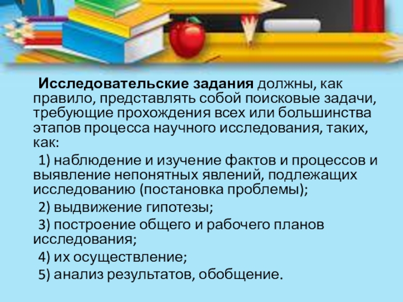 Слайд 11 Исследовательские задания должны, как правило, представлять собой поисковые задачи, требующие прохождения