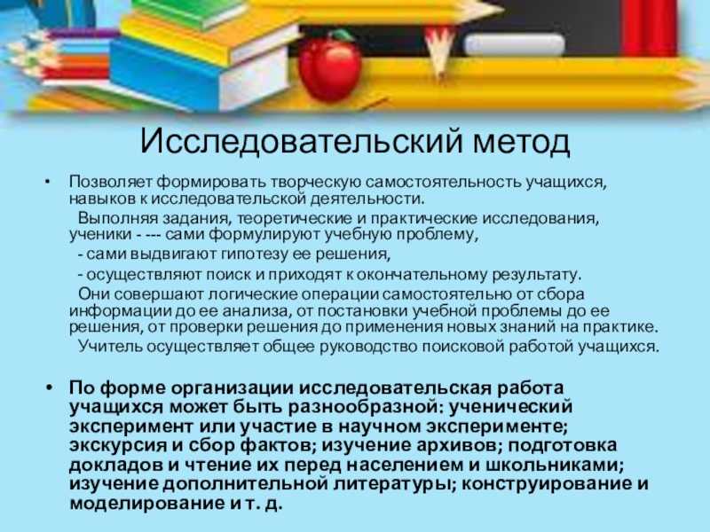 По форме организации исследовательская работа учащихся может быть разнообразной: ученический эксперимент или участие в научном эксперименте; экскурсия и сбор фактов; изучение архивов; подготовка докладов и чтение их перед населением и школьниками; изучение дополнительной литературы; конструирование и моделирование и т. д.