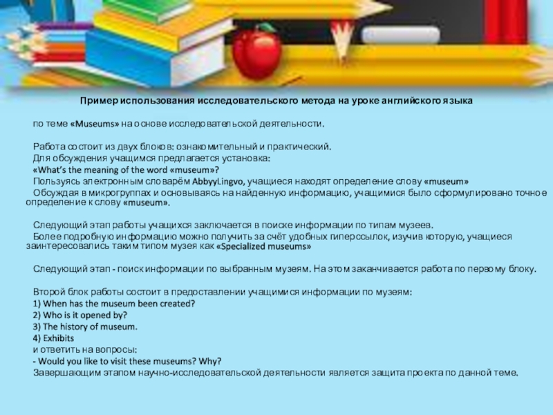 Слайд 12Пример использования исследовательского метода на уроке английского языка