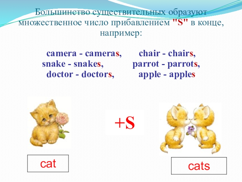 Большинство существительных образуют множественное число прибавлением "S" в конце, например: camera - cameras, chair - chairs, snake - snakes, parrot - parrots, doctor - doctors,