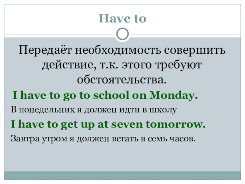 Have toПередаёт необходимость совершить действие, т.к. этого требуют обстоятельства. I have to go to school on Monday.