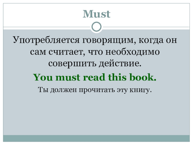 MustУпотребляется говорящим, когда он сам считает, что необходимо совершить действие.You must read this book.Ты должен прочитать эту