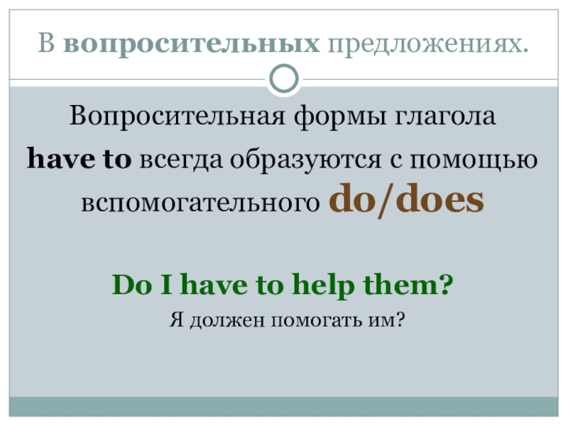 В вопросительных предложениях.Вопросительная формы глагола have to всегда образуются с помощью вспомогательного do/doesDo I have to help