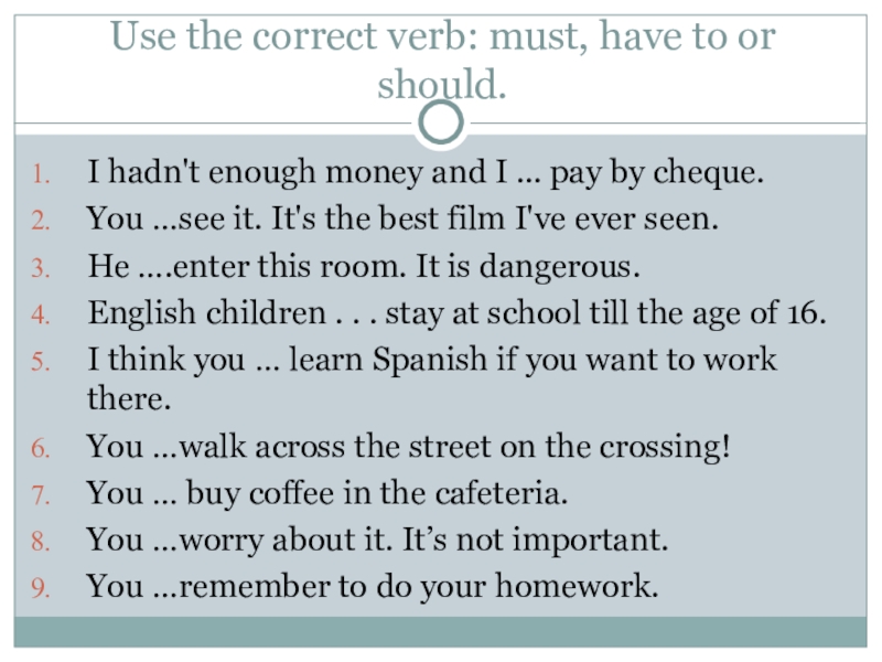 Use the correct verb: must, have to or should.I hadn't enough money and I ... pay by