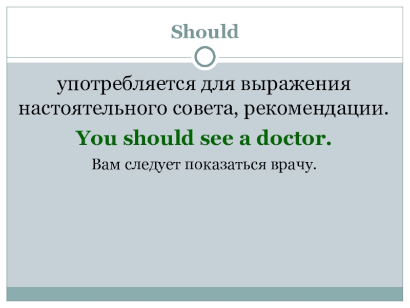Shouldупотребляется для выражения настоятельного совета, рекомендации.You should see a doctor. Вам следует показаться врачу.