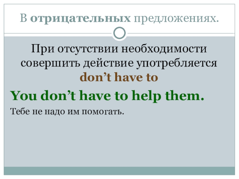 В отрицательных предложениях.При отсутствии необходимости совершить действие употребляется don’t have toYou don’t have to help them. Тебе