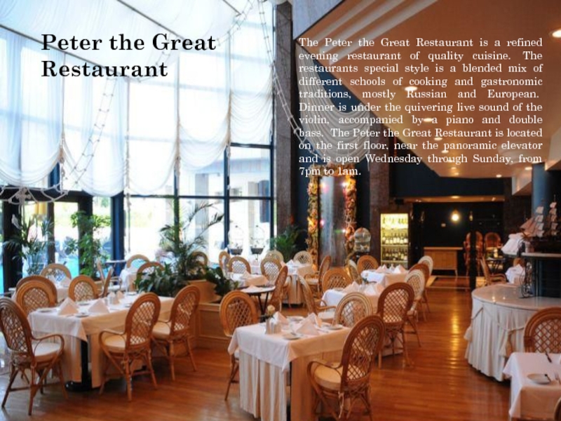 Dinner is under the quivering live sound of the violin, accompanied by a piano and double bass. The Peter the Great Restaurant is located on the first floor, near the panoramic elevator and is open Wednesday through Sunday, from 7pm to 1am.