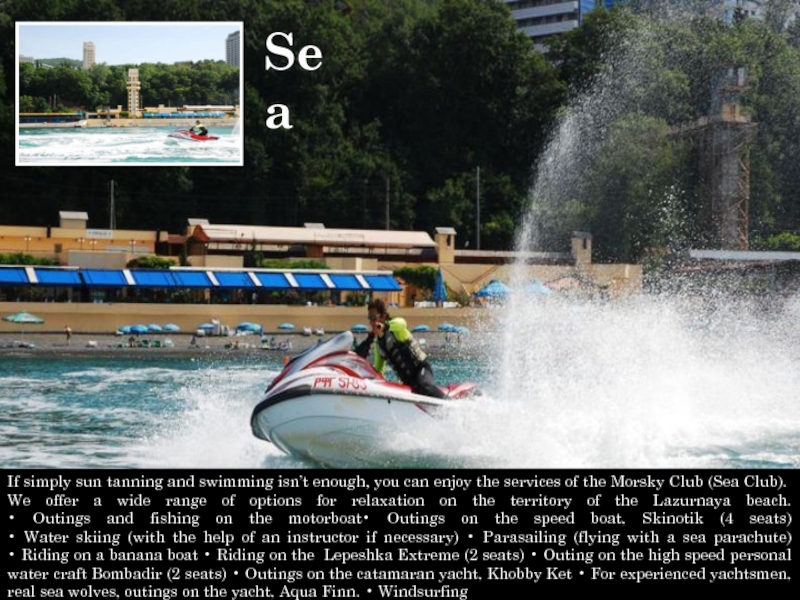 • Water skiing (with the help of an instructor if necessary) • Parasailing (flying with a sea parachute)