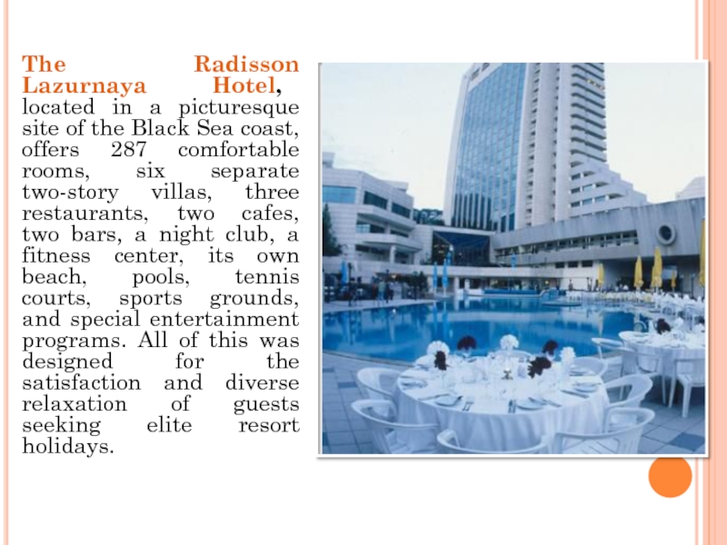 Слайд 24The Radisson Lazurnaya Hotel, located in a picturesque site of the