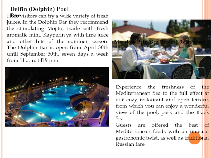 Guests are offered the best of Mediterranean foods with an unusual gastronomic twist, as well as traditional Russian fare.